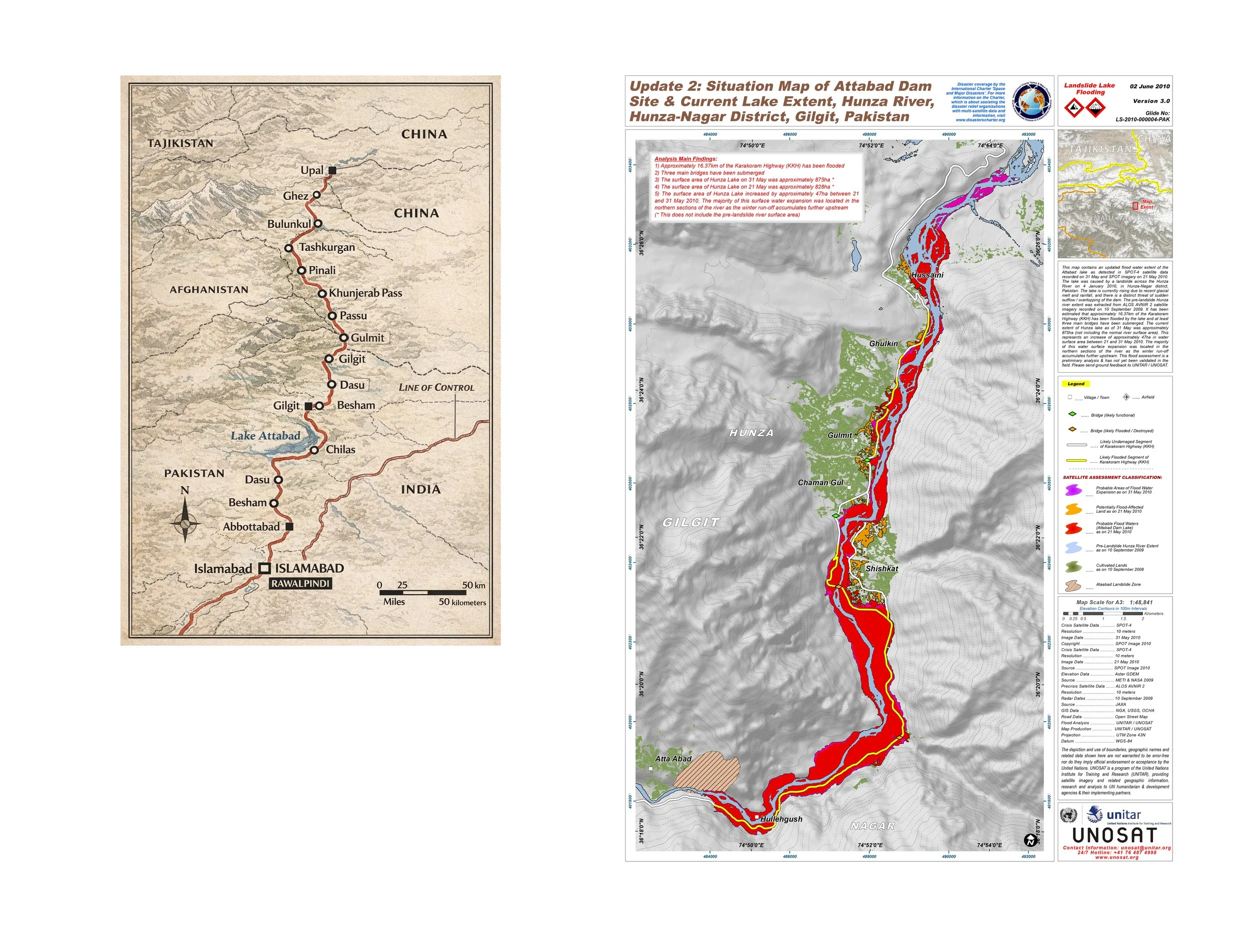 Locator map (left) and situation map (right) showing the Attabad landslide dam site and lake extent, Hunza–Nagar District, Gilgit-Baltistan, Pakistan, June 2010. Sources: locator map (artist); UNITAR/UNOSAT.